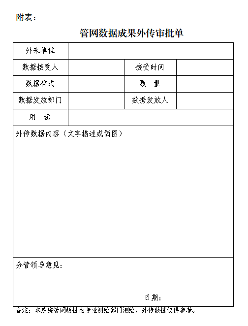 4.2.2因工作需要向集团公司以外人员提供打印输出的供水管网图(含背景地图)时,需经集团公司分管领导批准。数据输出部门要求对数据输出进行记录,记录表格填写详见附表。