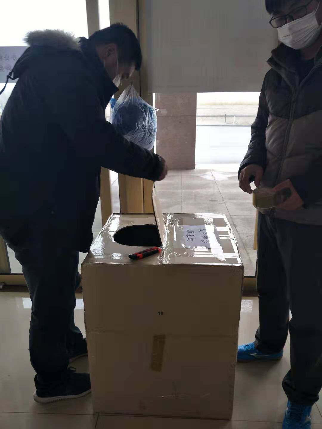 为做好公共区域的防护工作,公共场所必需配备废弃口罩带盖回收桶,虽然我们不具备,但是我们可以利用现有条件自己动手做,生产四班班长长包自皓将废弃的带盖消毒剂桶带到综合大楼前,设置废弃口罩回收桶;没有纸巾,他将从家带来的抽纸用胶带固定在电梯按键旁……,公共场所防护处置用品,他能想到的都一一设置好。2月12 日,公司购来一次性脚套,废弃脚套同样没有合适的回收桶,生产二班班长董立强就找来废弃大纸箱,自制经济适用的脚套废弃箱。他们说“做好防疫防护工作不分你我,协手战胜疫情才是我们的最终目标”。