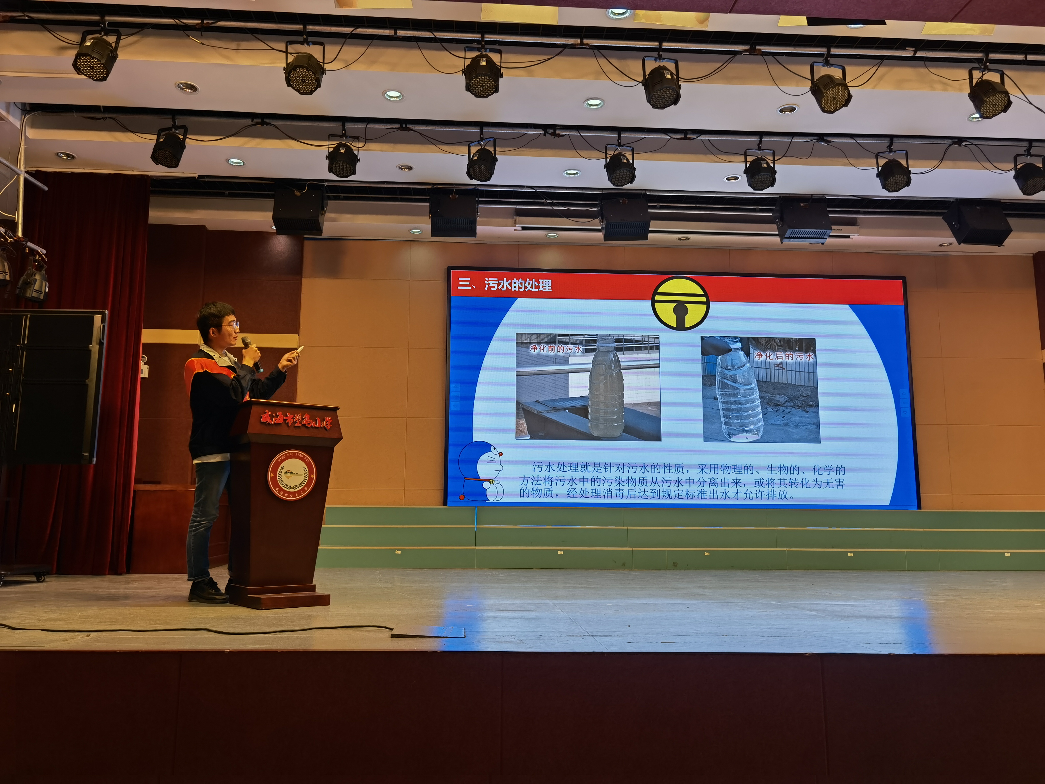 宣讲结束后,针对目前威海市水环境现状、净水工艺等,宣讲师与同学们进行了富有知识性、趣味性地现场问答互动活动。同学们提出了许多自己的疑问,有些问题稀奇古怪,让宣讲师们应接不暇。通过问题解答,让学生们清楚地了解到保护水资源、防治水污染、改善水环境、修复水生态的重要性,提高他们“知水、爱水、节水、护水”的意识。