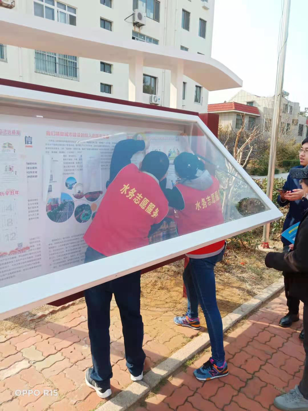 镜头二:第十联合党支部的志愿者们走进社区开展水务政策宣讲活动,并在社区宣传栏粘贴水务集团业务办理明白纸,进一步扩大宣传范围,让更多的威海市民了解水务集团最新便民服务政策;第五联合党支部的志愿者们向居民们发放垃圾分类宣传册,现场讲述垃圾分类投放的细节流程,让居民了解垃圾分类的意义,普及垃圾分类的相关知识,共同做到保护社区环境,为精致威海城市建设贡献力量。