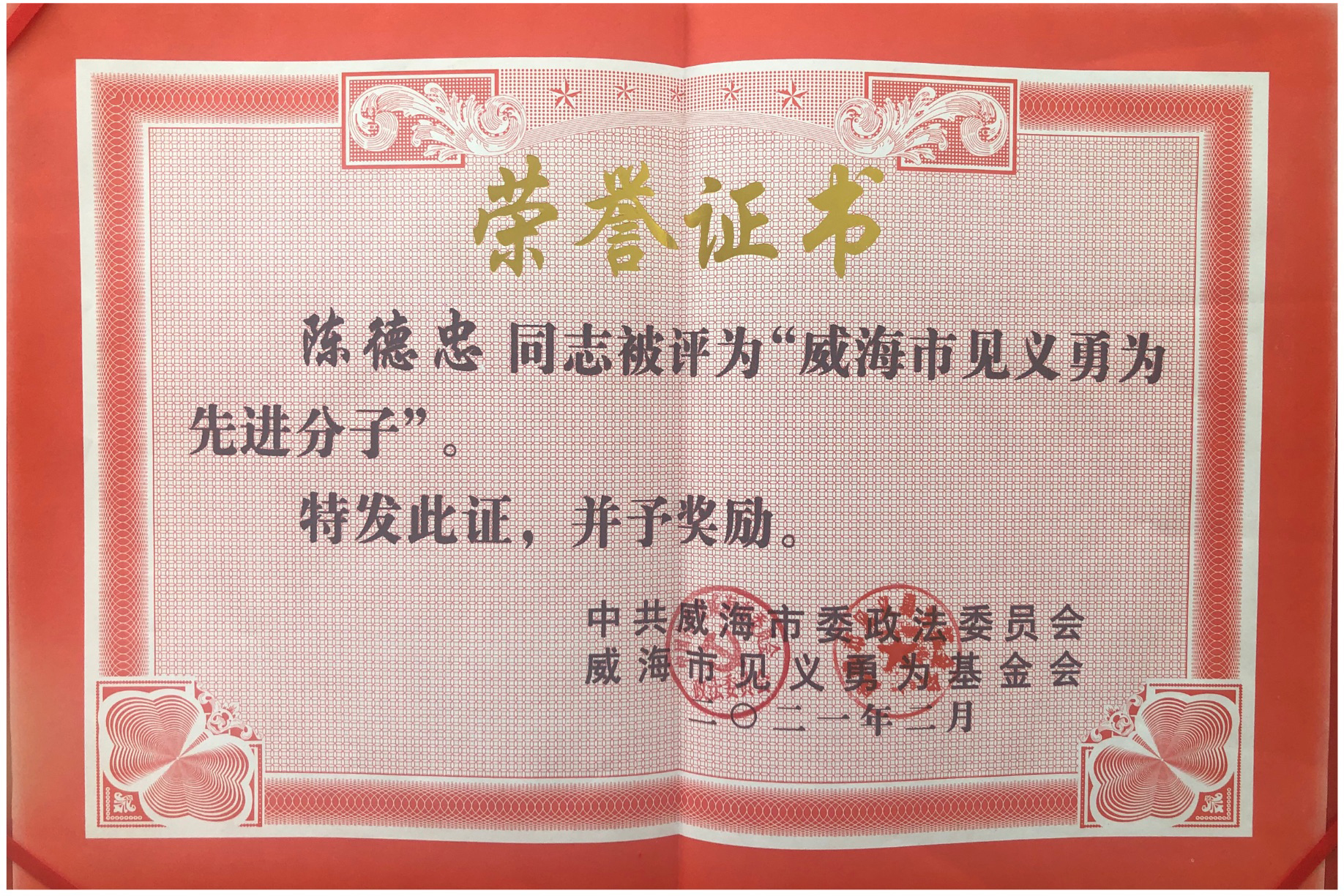 市水务集团羊亭辖区保安陈德忠被授予“威海市见义勇为先进分子”荣誉称号